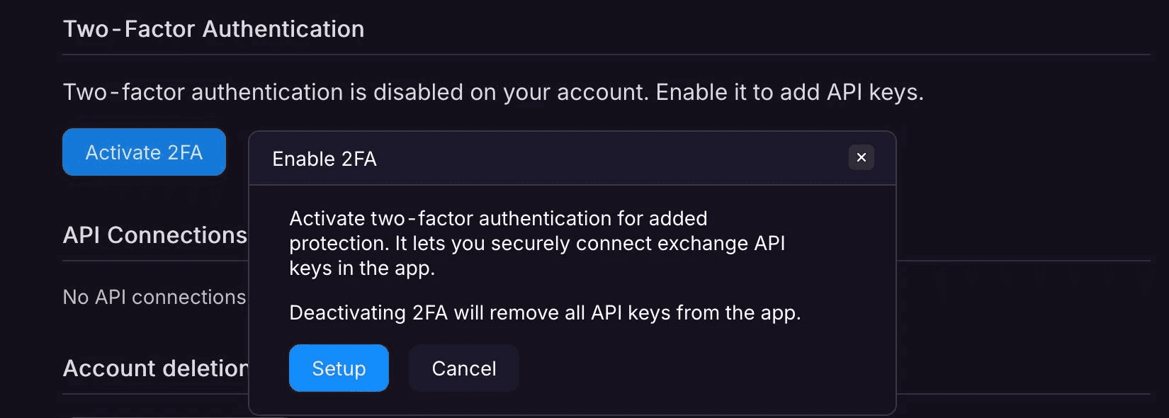 В экосистеме Skalpy включение 2FA является обязательным требованием для добавления API-ключей и доступа к торговому функционалу.